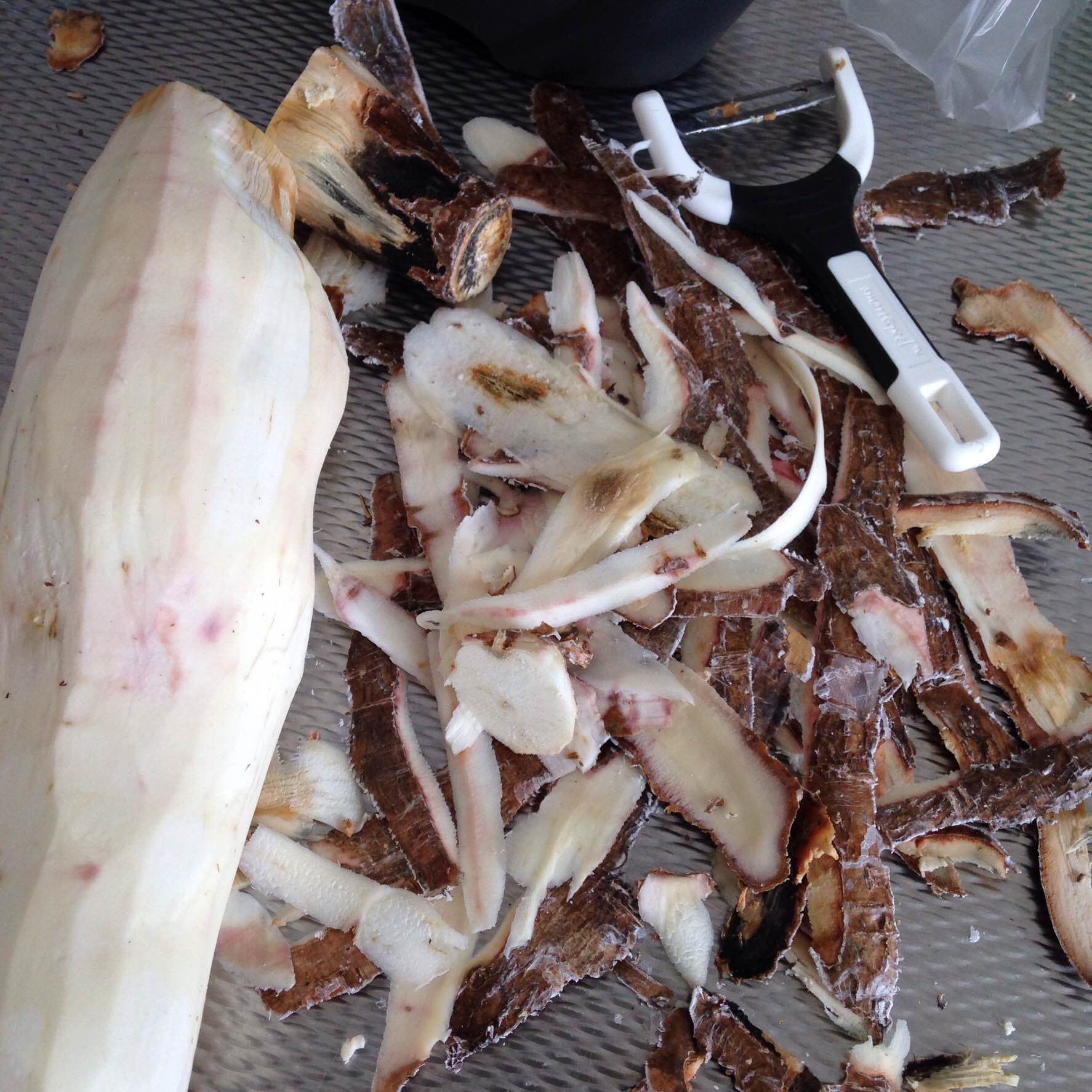 Tijdens het koken was ik Cassave aan het schillen, en toen dacht ik opeens; kan je die schillen niet gewoon in de pot bij de banaan gooien als soort vorm van voeding/compost ?