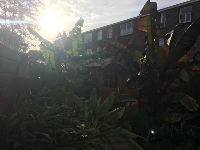 Een zijscheut had ik echter binnen gezet maar heeft nooit heel hard gegroeid. Deze heb ik elk jaar naar binnen gezet. half december 2015 dus ook. Nu hij binnen staat groeit hij vrolijk verder, sterker nog, hij begint in bloei te komen. Hij is slechts 1,35 meter hoog. Heeft dit binnen kans van slagen? Zo ja, kan hij in het voorjaar weer directe zon aan als ik hem buiten zet, of gaan de bloem en bananen verbranden?