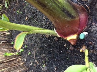 De plant drukt zich wat op als ie wat langer in de grond staat. Tevens komt de echte stam ook steeds hoger naarmate er steeds bladstelen afsterven. Het lijkt zelfs een beetje een verhoutte stam te gaan worden.