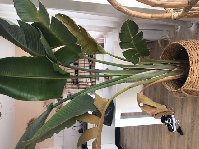 Wat me wel zorg baart is de pot - als dit een dichte pot in mand is, dan is dat niet optimaal: Ook strelitzia heeft afwatering nodig van onder (pot met gaten, schotel etc).