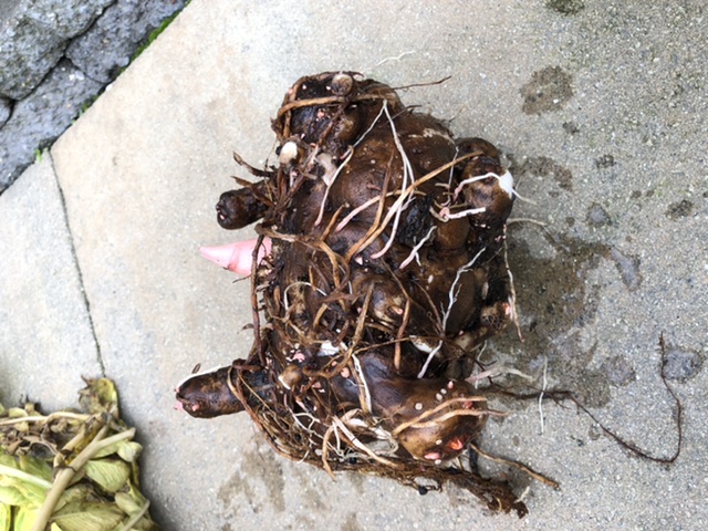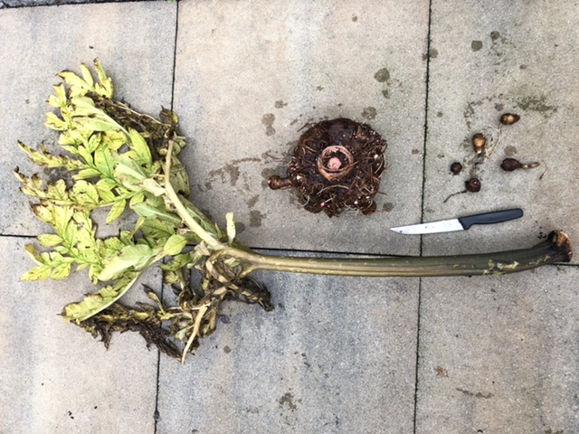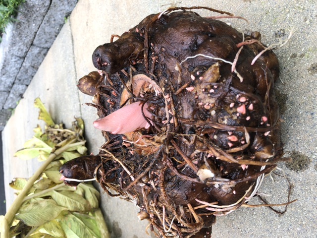 Sinds een aantal jaar heb ik een Amorphophallus konjac. Nu zag de plant er niet echt fraai meer uit door de naderende winter dus heb ik de overblijfselen eraf gehaald en de knol uitgegraven. Zoals jullie op de foto’s kunnen zien zit er een behoorlijk nieuw groeipunt direct onder de resten van de stengel.