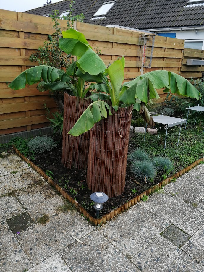 Doe er voorlopig nog niets aan. 1 a 2 graden vorst van korte duur kan geen kwaad en dringt niet door tot het binnenste van de plant. Te vroeg of nat inpakken kan overigens ook geen kwaad voor een Musa. Het is wat dat betreft geen palm die speerrot krijgt. Hier worden de stammen van de bananen met een sok van noppenfolie beschermd, daarin een lichtslang langs de stam. De folie en slang mogen gewoon in contact komen met de stam en hoeft niet verlucht te worden. In het voorjaar, wanneer de bescherming eraf gaat is het vaak een natte, broeierige bedoeling.