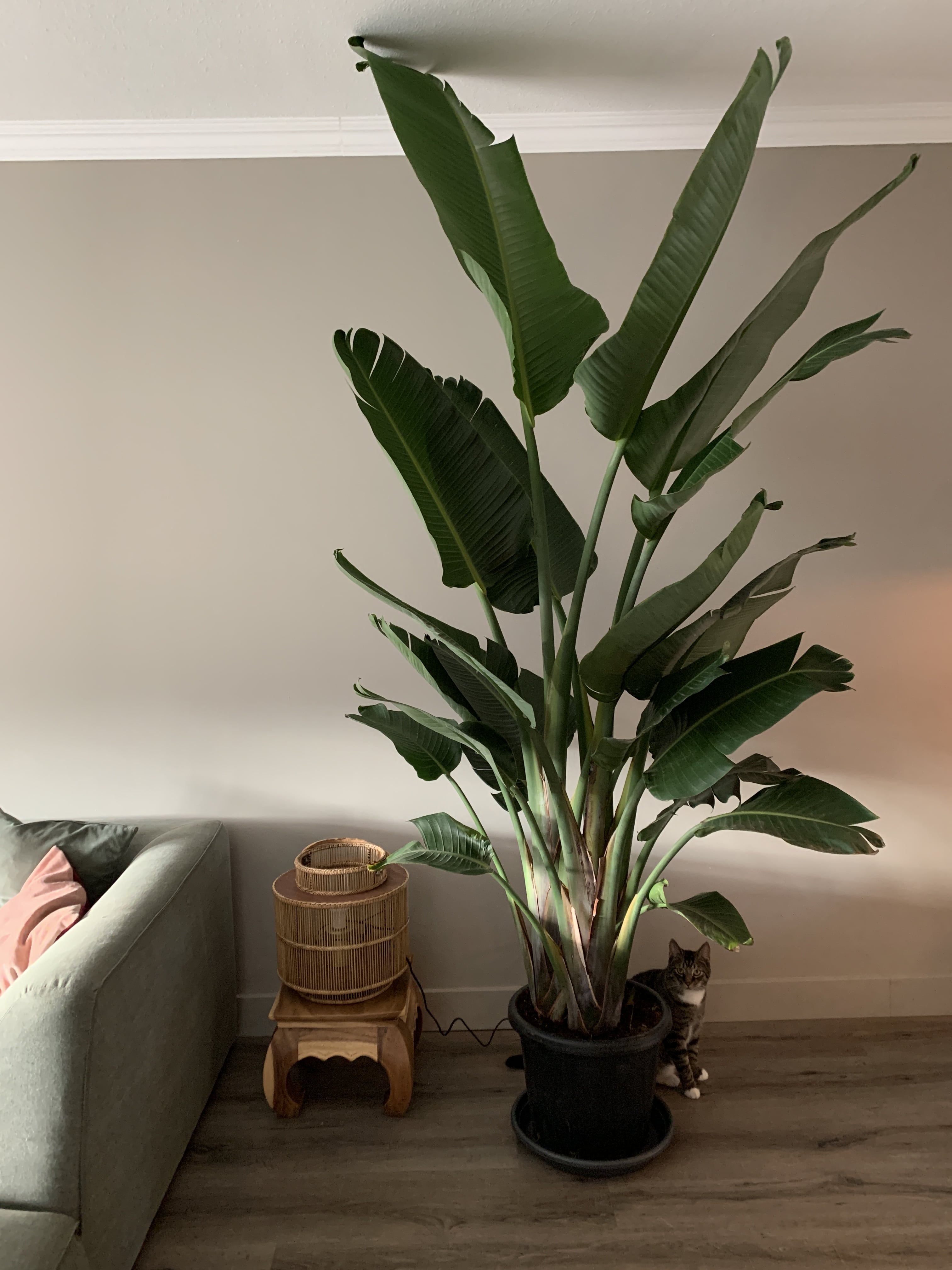 Ik geef hem 1/2x per week een klein beetje water, ook vraag ik me af of hij hier genoeg licht krijgt en of de pot die we erbij kregen wel groot genoeg is. Ik zie namelijk soms kleinere sterlitzia's dan dit die wel in veel grotere potten zitten. Ook las ik iets over bladeren schoonmaken.