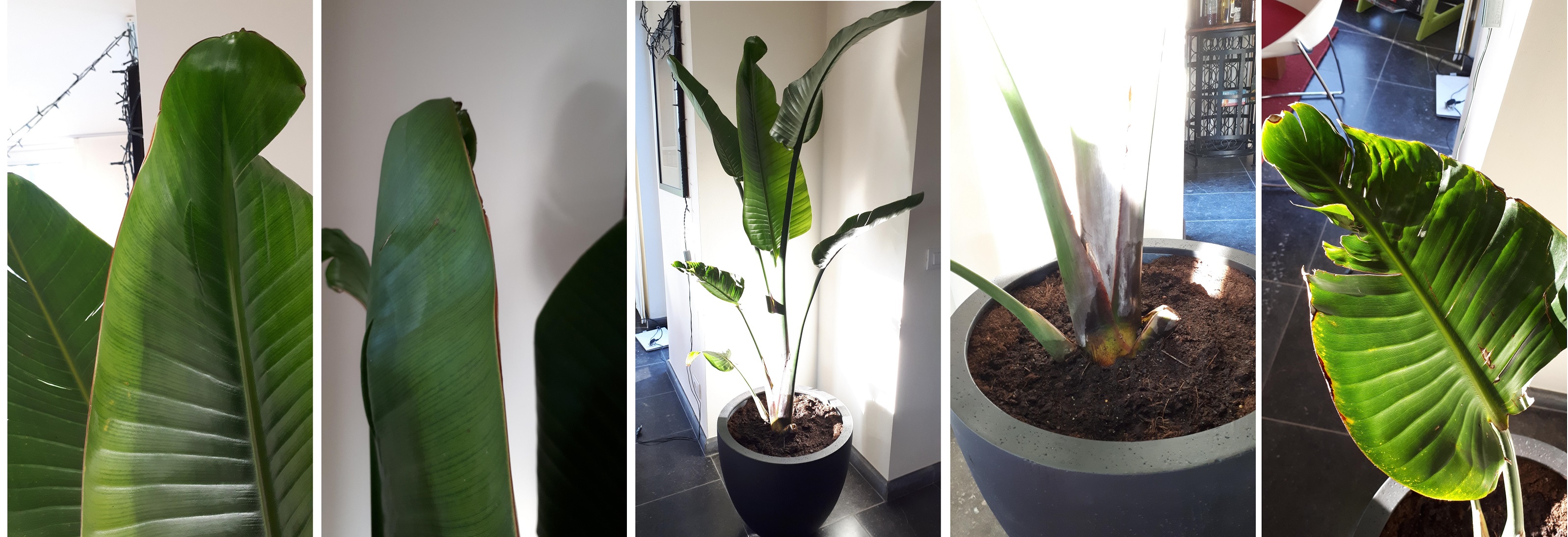 We hebben net een strelizia nicolai in huis gehaald, zie foto's. De plant staat in medium lichte ruimte, met direct ochtend zonlicht. Staat hier nu een dag of vijf, al 4 liter watergegeven want stond droog toen we het toekregen. Probleem is er komen bruine randen op de bladeren, en 1 vd onderste bladeren ziet er niet fris uit (zag er goed uit toen we ze kregen). Is dit een normale acclimatisatie? We hebben vloerverwarming 20 graden.