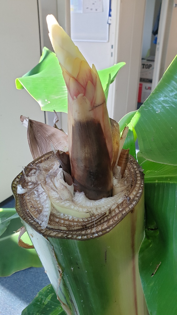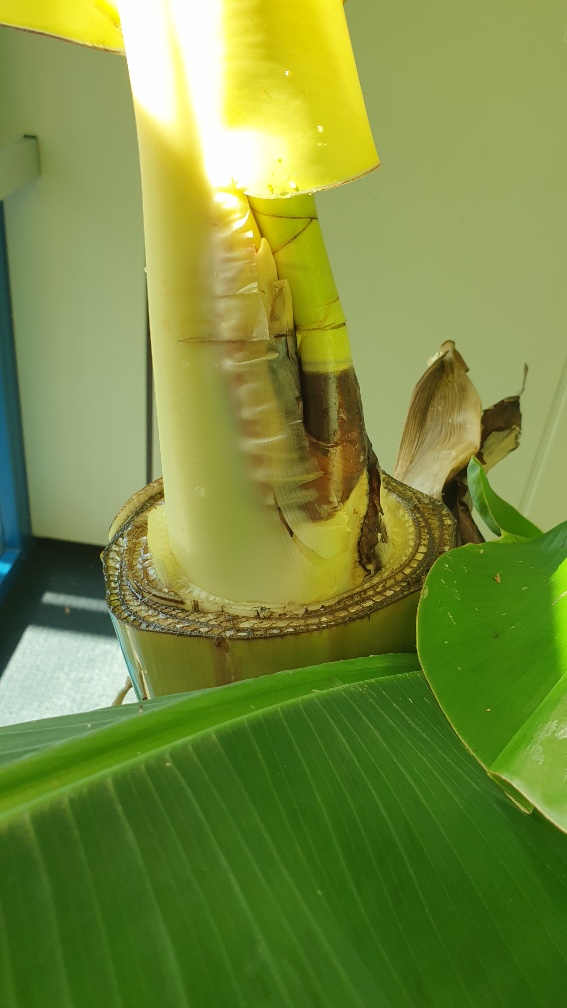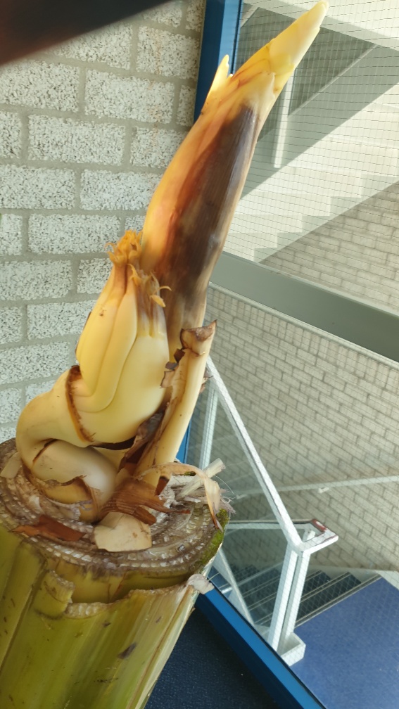 Met deze gedachte en de kans dat er een bloem dwars zou kunnen zitten ivm de leeftijd van de banaan bladeren gaan verwijderen. Net zo lang totdat er een top van een bloem zichtbaar werd, heel bleek natuurlijk want deze had nog geen licht gezien om kleur te bekennen.