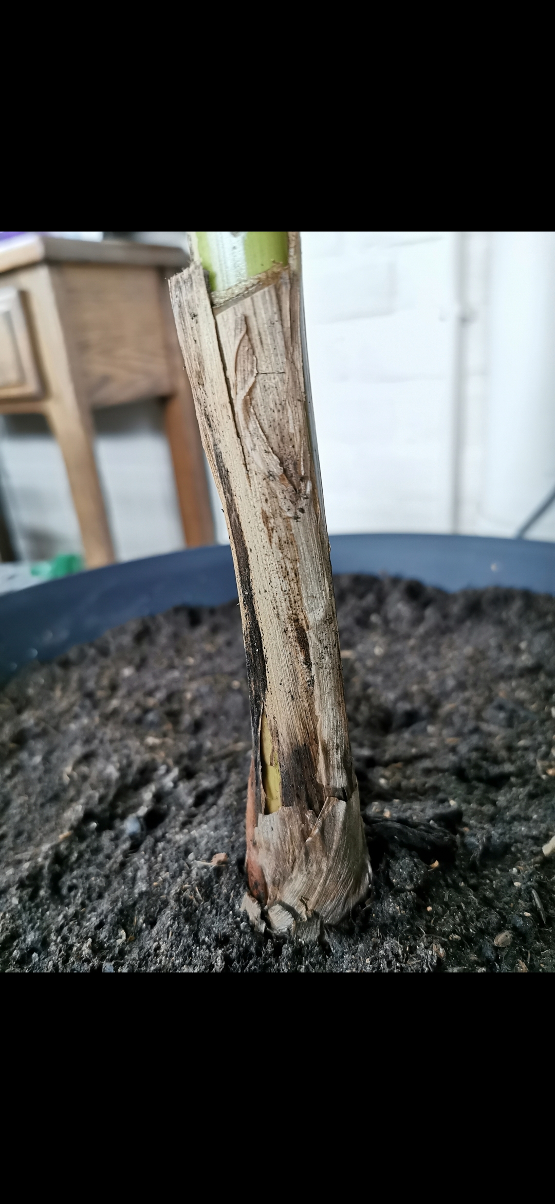 Zoals de titel al zegt; ik heb vandaag mijn nieuwe musa dajiao gekocht, deze is totaal ongeveer 50 cm lang. Hij had alleen bij aankoop al zwarte plekken op de stam en verdorde stukken stam (zie foto). Betekent dit dat hij nu al rot is? Zo niet, kan ik dit er dan gewoon aan laten. Lijkt me dat de stam heel dun wordt als je het eraf trekt.