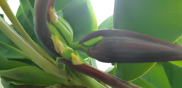 Maar ook in 2020 is het mogelijk bananen te oogsten. Onze plant gaf bloemen in april/mei en toonde in juni een begin van een trosje. In december konden we oogsten!