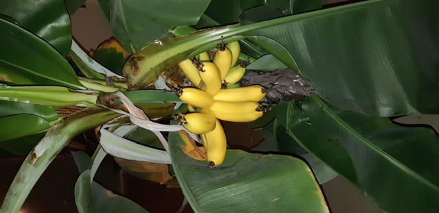 De bananen rijpten aan de plant totdat ze geel werden en vielen er spontaan af. We hadden dus wel iets eerder kunnen oogsten. In totaal zo’n 14 bananen en nog wat kleine beginsels die niet volgroeid werden.