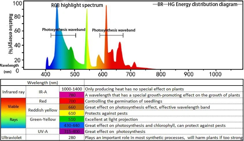 Te zien is dat de lamp rode en blauwe leds, een infra rode, een ultra violette en een witte led bevat en het is daarmee dus een full spectrum lamp. De kleuren zijn afgestemd op de behoefte van planten en de lichtopbrengst naar de plant is daardoor groter dan het voor het oog lijkt. Het menselijk oog is vooral gevoelig voor geel-groen licht waar planten weinig aan hebben.