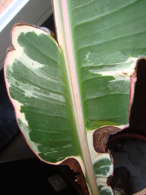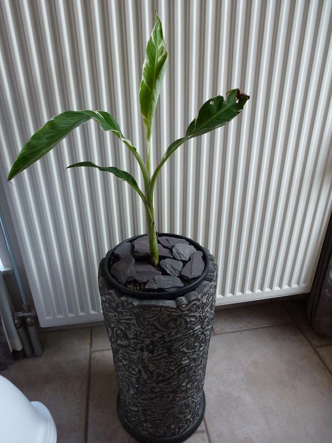 Op de ruilbeurs van Canna Banana ben ik de trotse eigenaar geworden van een bonte Musa. Merkwaardig dat er niet meer interesse voor was want de plant (samen met zijn grotere broer) stonden er al enige tijd alvorens mijn oog er op viel. Volgens de verkoper zou de moederplant zijn meegebracht uit de Philippijnen en zou het om een Musa Icecream variegata gaan. Persoonlijk dacht ik eerder aan de Musa aeae 'Florida' maar ik ben ook geen specialist he. In ieder geval kan ik over de icecream variegata niets terugvinden. Wat denken jullie er van?