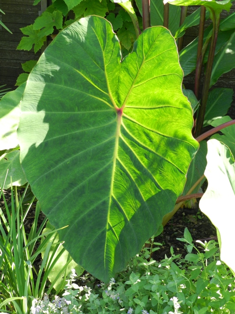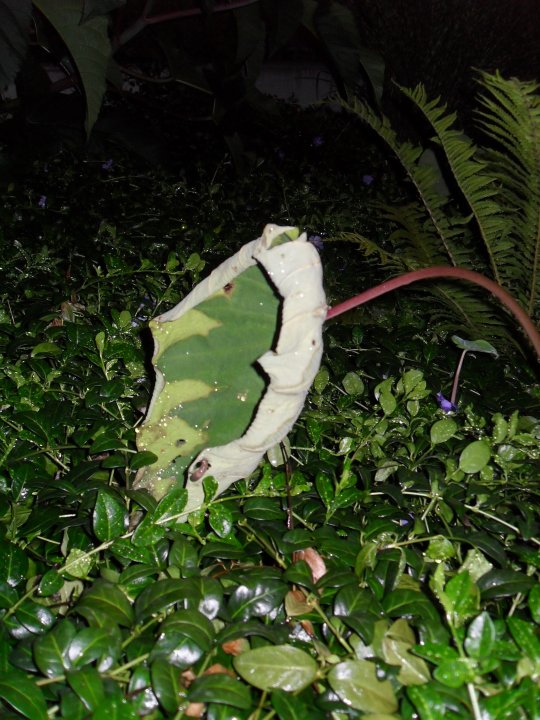 Ik heb Colocasia Pink China voor het eerst in volle grond , (komt nog van Bart -djoeke)groeit prima en is al groot ttoz van wat het was , maar tegen volle zon kan deze ondersoort blijkbaar niet ,ondanks dat ze alle dagen een goede gietbeurt kregen , al voor de tropische hitte liet hij al de oren hangen met veel blad verbrand