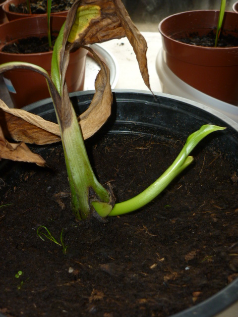 Het is geen nieuwe scheut maar het groeipunt wat een nieuwe weg heeft gezocht omdat er een verstopping zat, bij palmbomen en Musa's komt dit ook soms voor.