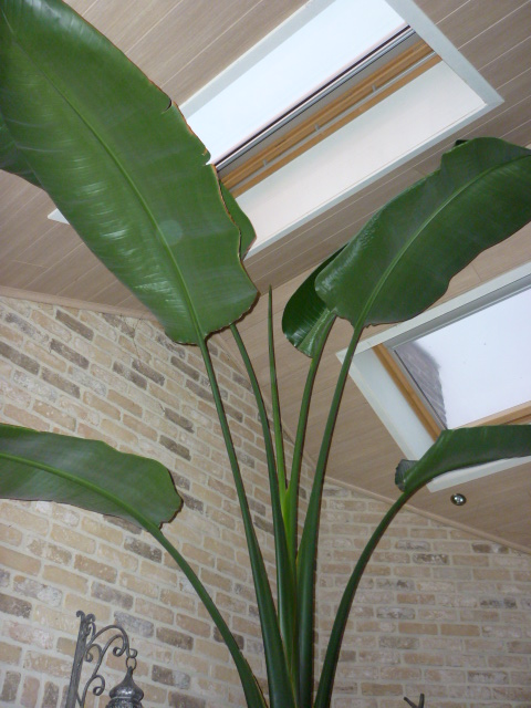 hallo cedric ,ik heb zo een zelfde probleem , mijn strelitzia zit tegen het 4.30 m hooge plafond van mijn keuken aan . ik laat die gewoon doen en eenmaal het blad aan het ontvouwen is zakt het toch wat naar beneden .vroeg of laat word hij toch te groot en moet hij weg ,die van u kan je nog altijd de stam wat af snijden maar dat is natuurlijk ook niet zo leuk , bij die van mij is dat waarschijnlijk niet mogelijk toch is het familie van de musa . ik hoop dat je er een oplosing voor vind :D