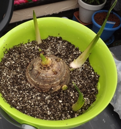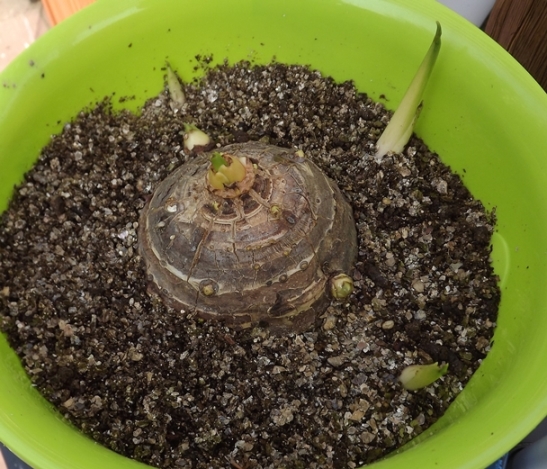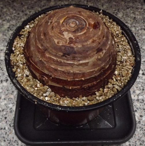 Hij staat nu buiten in een emmer met zijn kont op de potgrond maar verder in de vermiculiet.