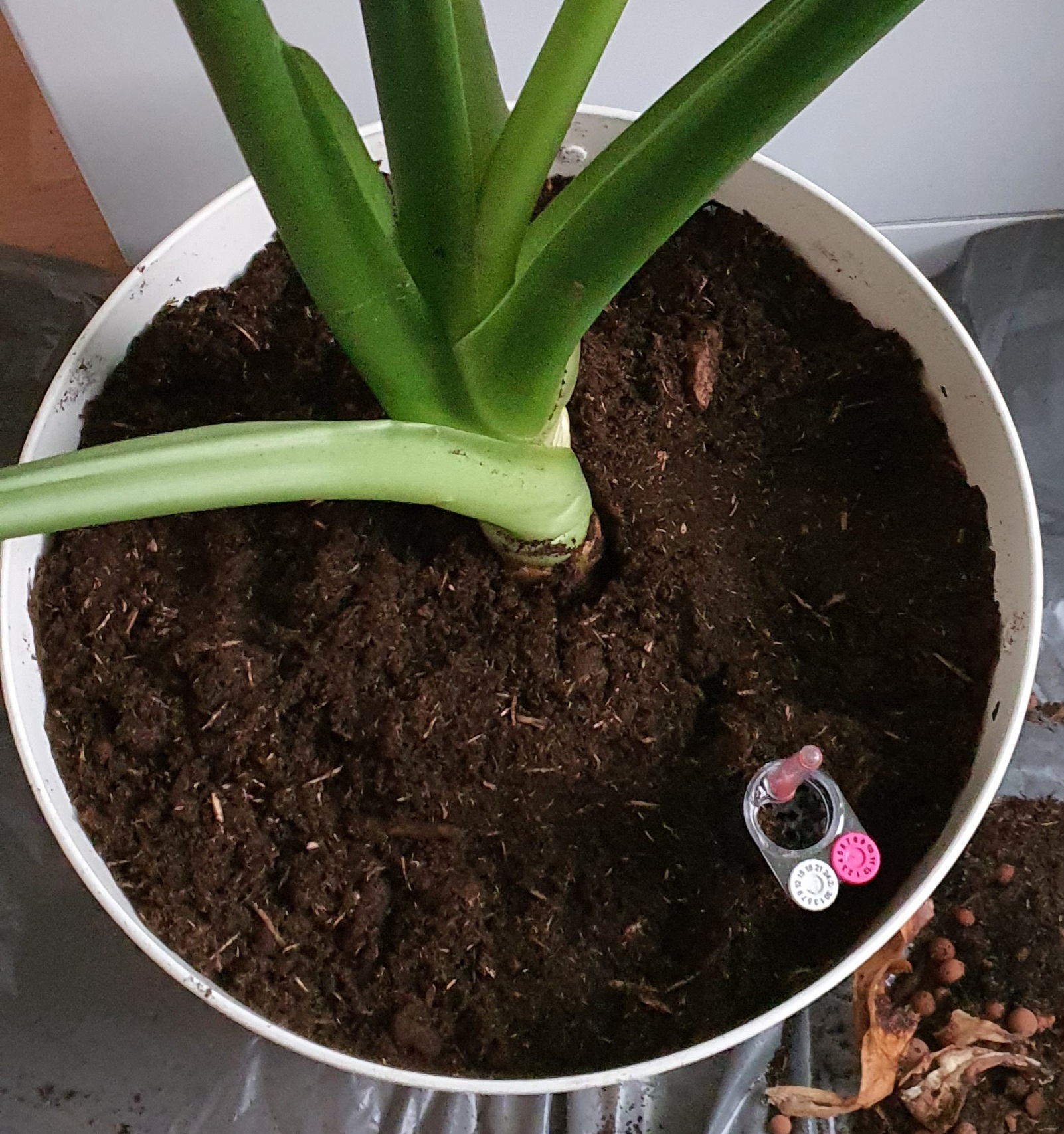 Heeft er iemand tips om een Alocasia na overpotten stabiel te zetten? Nu valt hij steeds om en ik ben bang dat de bovenste wortels van de stam afscheuren. In de oude pot kon hij ook niet meer gewoon rechtop staan. Hij moet nu tegen een muur of tafel steunen.