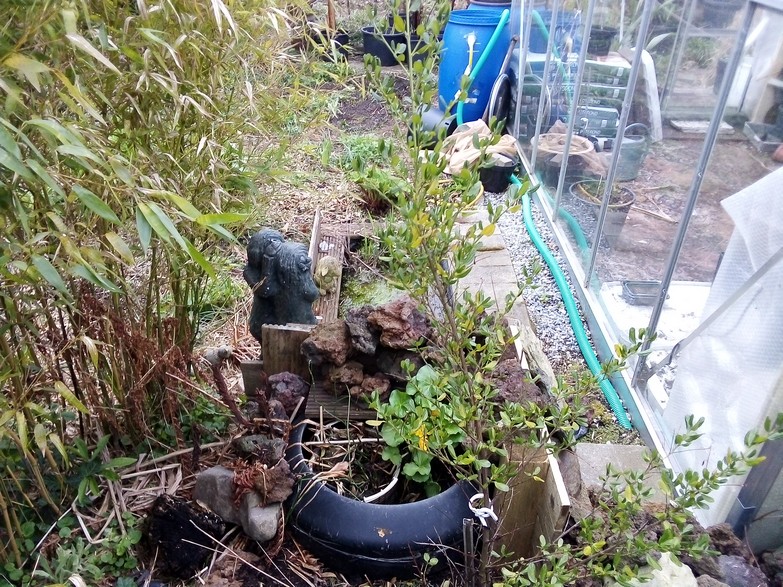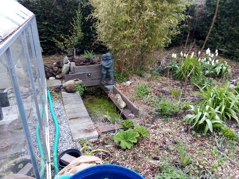 Even wat foto's toegevoegd. Vooraan zie je de gunnera al staan, heeft winter mooi overleefd. Achteraan, dat rond ding, gaat weg en daar graaf ik een kleine ton in de grond voor een vijvertje. Zo kan die zand al in de badkuip ter opvulling