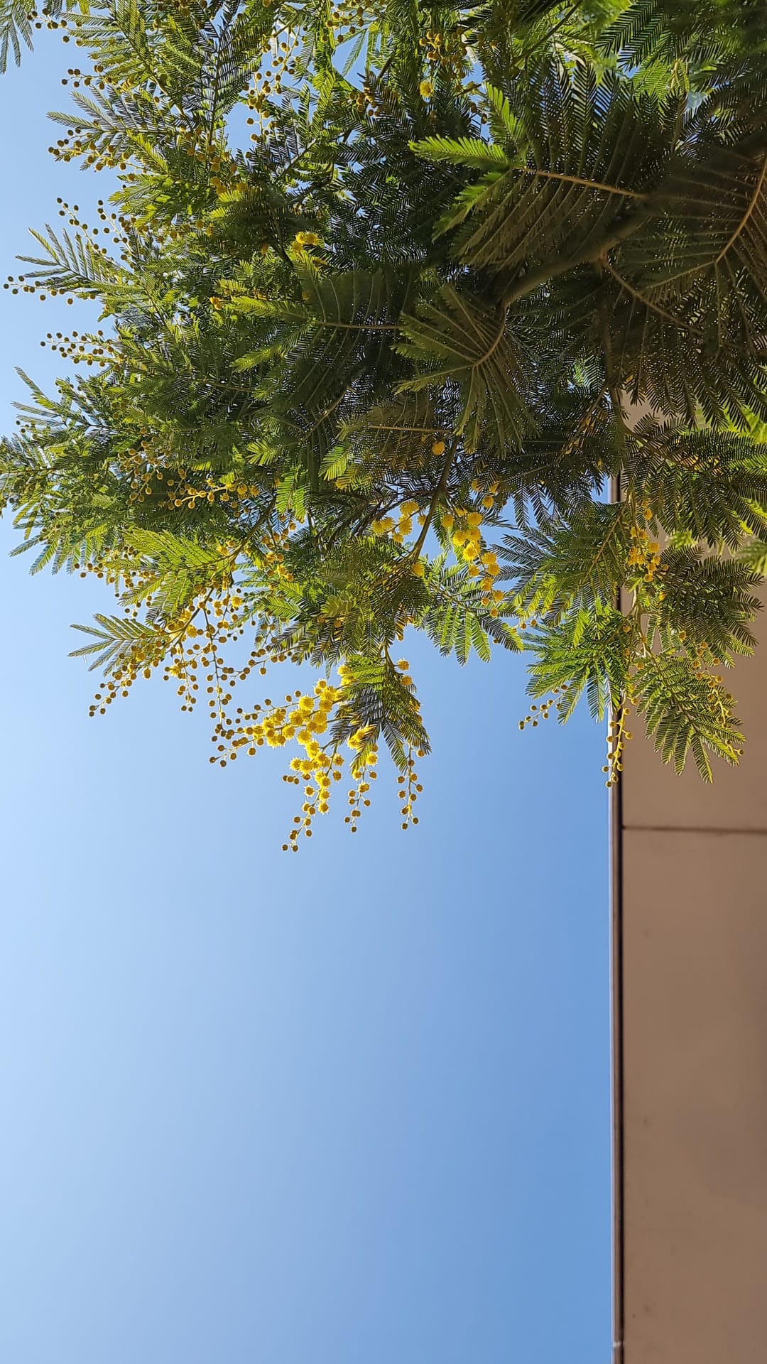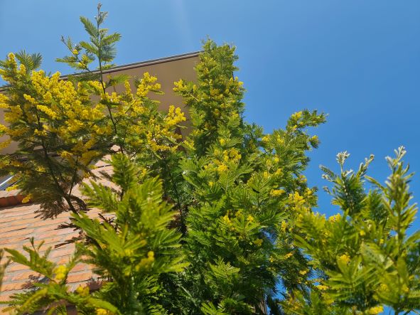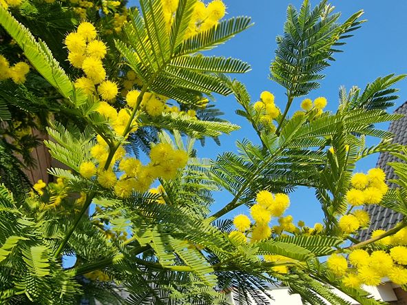 De kluit had alle ruimte, maar er ontstond een kluwen wurgwortels, waardoor de plant zichzelf afknelde. Ik ben nog aan het dubben. Ik heb op de oude plek een gele jasmijn (Gelsemium) geplant. Die groeide in een jaar ook tot 3 m hoog. Ik ben heel benieuwd naar de bloei. Als deze de vorst een beetje trekt en de bloei is mooi, dan mag deze blijven, Zoniet, dan komt de mimosa op die plek terug. ik heb nog een alternatief, maar nog geen knoop doorgehakt. Mimosa moet toch een beetje beschut staan en ik moet m kunnen beschermen.