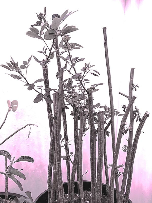De takken die ik bij het planten had afgeknipt en gestekt zijn aardig aan het uitlopen. Zou de plant in de tuin doodgaan dan heb ik nog genoeg vervanging: