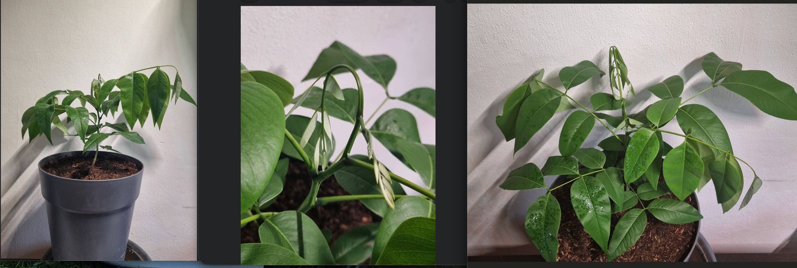 Mijn 3e Moringa die buiten mijn klimaatkast stond was helaas gevallen en daarbij is zijn wortelsysteem goed beschadigd geraakt. Weer snel terug in de pot gestopt, maar begon al snel slap te hangen, toen water gegeven waarna een opleving kwam.