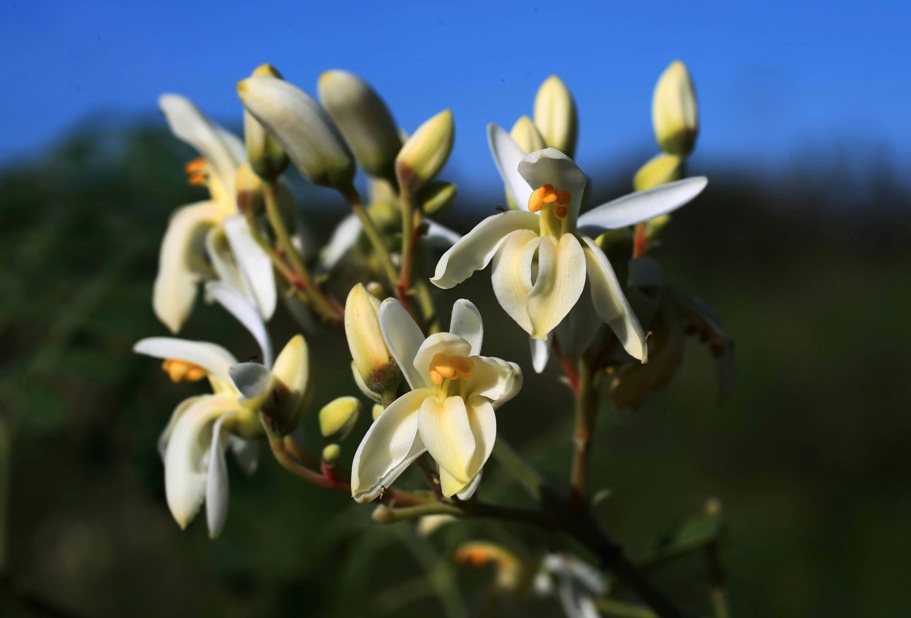 Die Golden Shower is ook zo'n kostbaarheid geworden neem ik aan. Het is inmiddels een fraaie plant geworden die zo te zien grootste ambities heeft. Nog even en dan kan hij ook in de tuin. De Moringa groeit ook aardig, maar vergeleken met de Golden Shower is hij toch heel wat bescheidener. Oogsten om zelfvoorzienend te worden in je culinaire behoeften zal lastig worden.