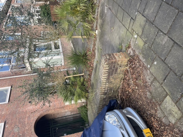 Een aantal straten verderop staat er eentje die afgelopen winter zonder bescherming overleefde, maar de eigenaren hebben de plant vervolgens afgezaagd... Nu bestaat 'ie uit meerdere sprieterige koppen.
