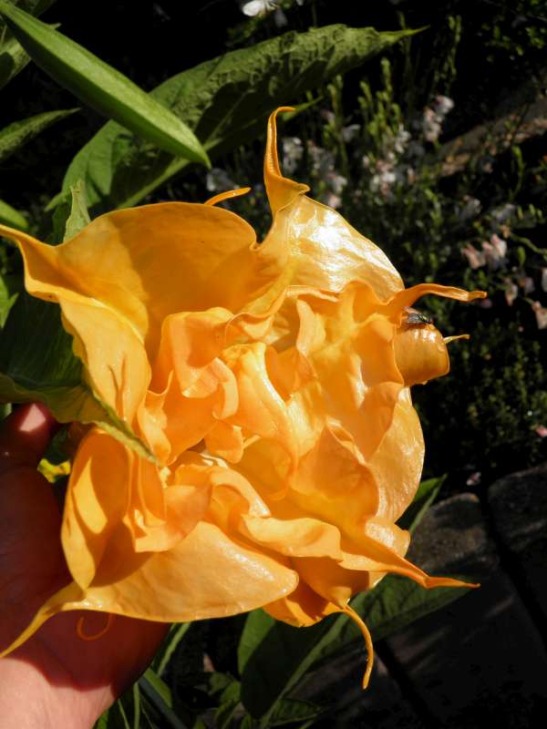 Een forse brugmansia met heel mooie waxy bloemen die weinig geuren. De plant draagt een raadsel met zich mee: de kweker (Langenberg) wil nl. niet bekend maken uit welke kruising deze LBG is voortgekomen. De bloemen kunnen in hun laatste fase oranjekleurig worden. Het is even een trendy plant geweest: iedereen wilde hem hebben. Maar gelukkig worden nu steeds vaker ook de andere brugmansias ontdekt.