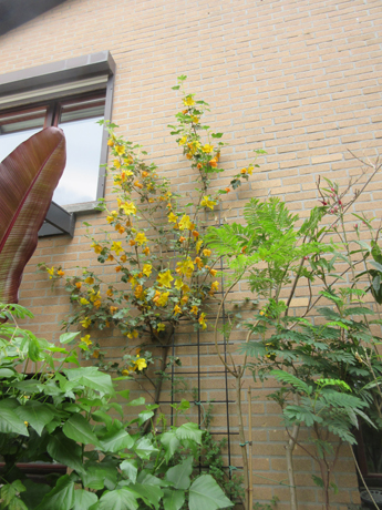 Hoi Fons, die staat in een pot van 20 liter, is echt niet winterhard genoeg om buiten te laten, is 2,5m hoog en wordt in de winter ingegraven in de kap.