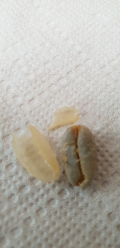 Eerste rijpe zaden uit hun jasje gehaald. Vruchtvlees smaak licht zoetig en volgens insiders uit de koffie business dus eetbaar ;) .