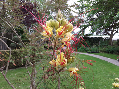 Bloeiende planten zijn niet mijn specialiteit maar ik heb sinds vorig jaar Caesalpinea gilliesii die inmiddels (alweer) bij een ander geslacht is ingedeeld - Erythrostemon gilliesii. Ik was erg in mijn nopjes toen de wat verwaarloosde plant met verse potgrond onlangs bloemknoppen vormde. Gisteren gingen de eerste knoppen open maar vandaag waren de bloemen alweer verwelkt. Bloeit deze zo kortstondig of is misschien de kaswarmte teveel van het goede?