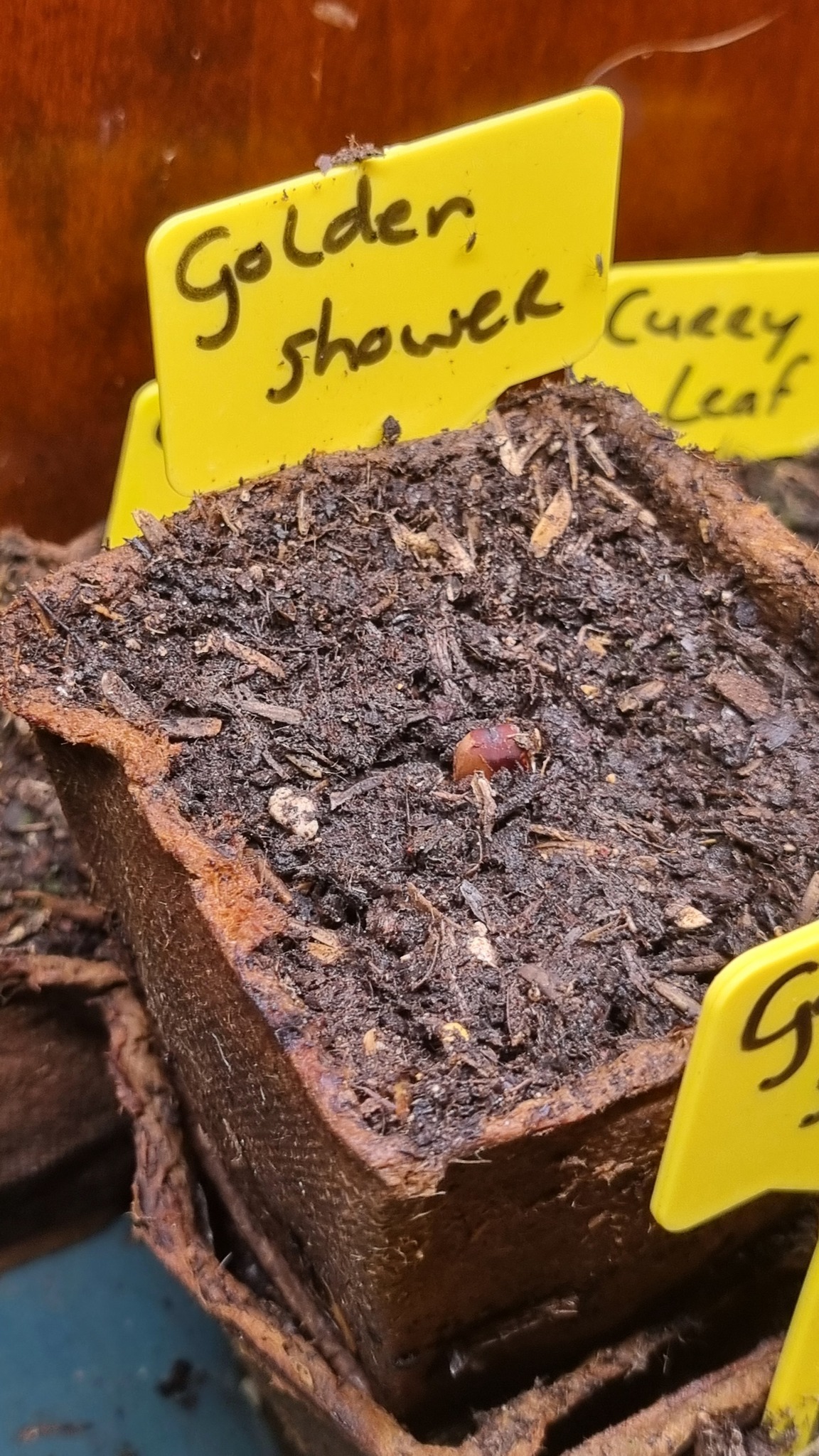 Gefeliciteerd met je succes met de Golden Shower! Het ligt voor de hand dat die andere zaden toch ook eens tot leven moeten gaan komen. Voor moeilijke zaden is dit toch wel een goede methode omdat ze dan minder gevoelig zijn voor rot en voldoende zuurstof hebben om uit te gaan lopen.