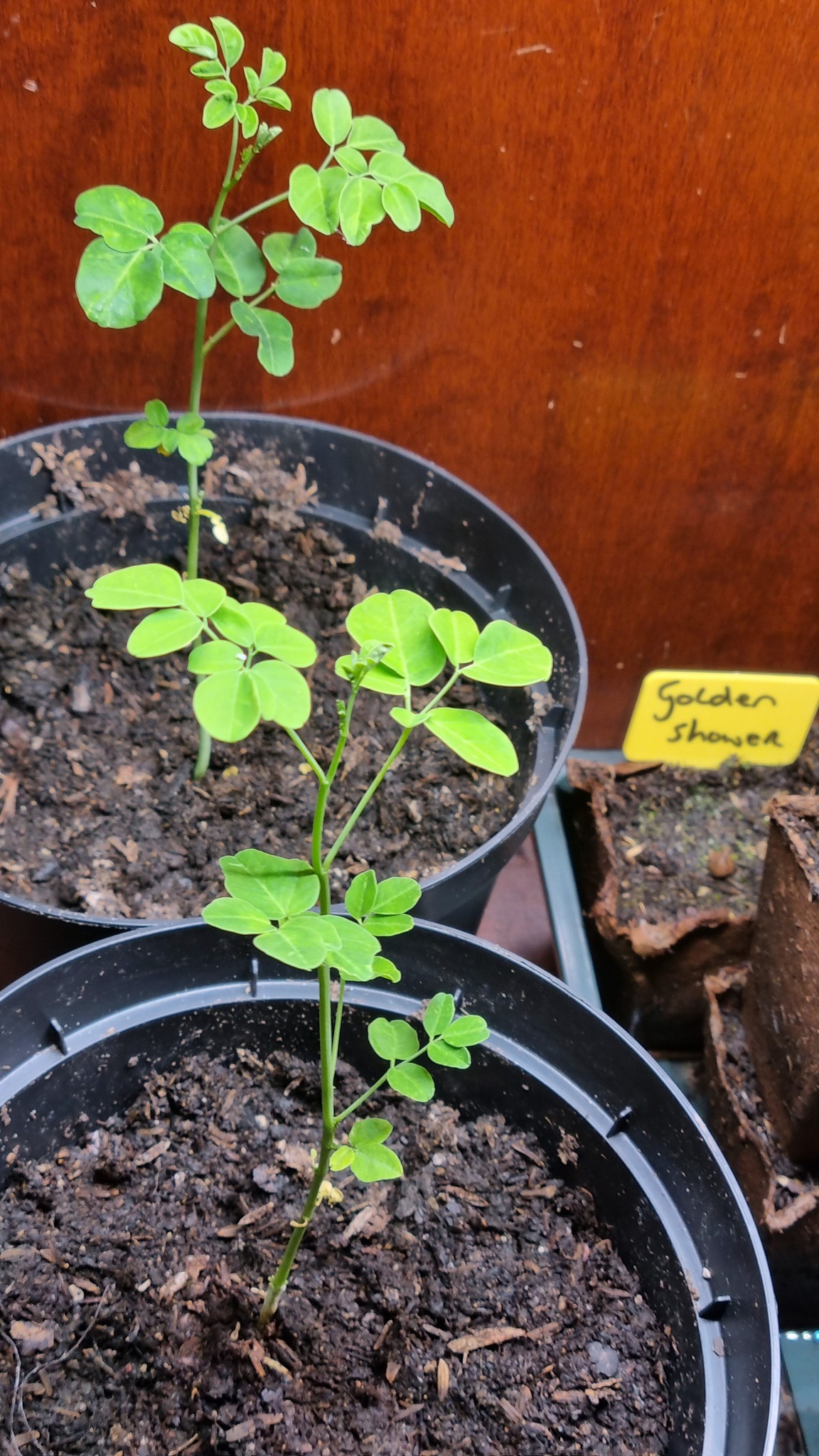 De Golden Shower doet het rustig aan en dat gaat ook een mooiere struik worden dan die Moringa's. Eerlijk gezegd, meestal geven die Moringa's meer problemen dan plezier. Met die Cassia's is het andersom. Alles is mooi aan die planten. Als het bij die ene plant blijft dan kan je altijd stekken als je er meer wilt.