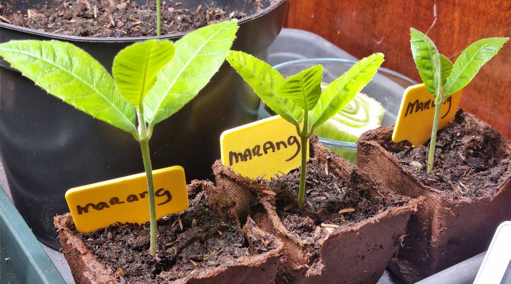 Die Marang ken ik niet, maar het worden grote bomen en misschien worden ze decoratief maar dat zie je dan wel. Voorlopig doen ze rustig aan en dat is een goed teken. Je hebt gezien de grootte van de potten wel op een flinke groei gerekend.