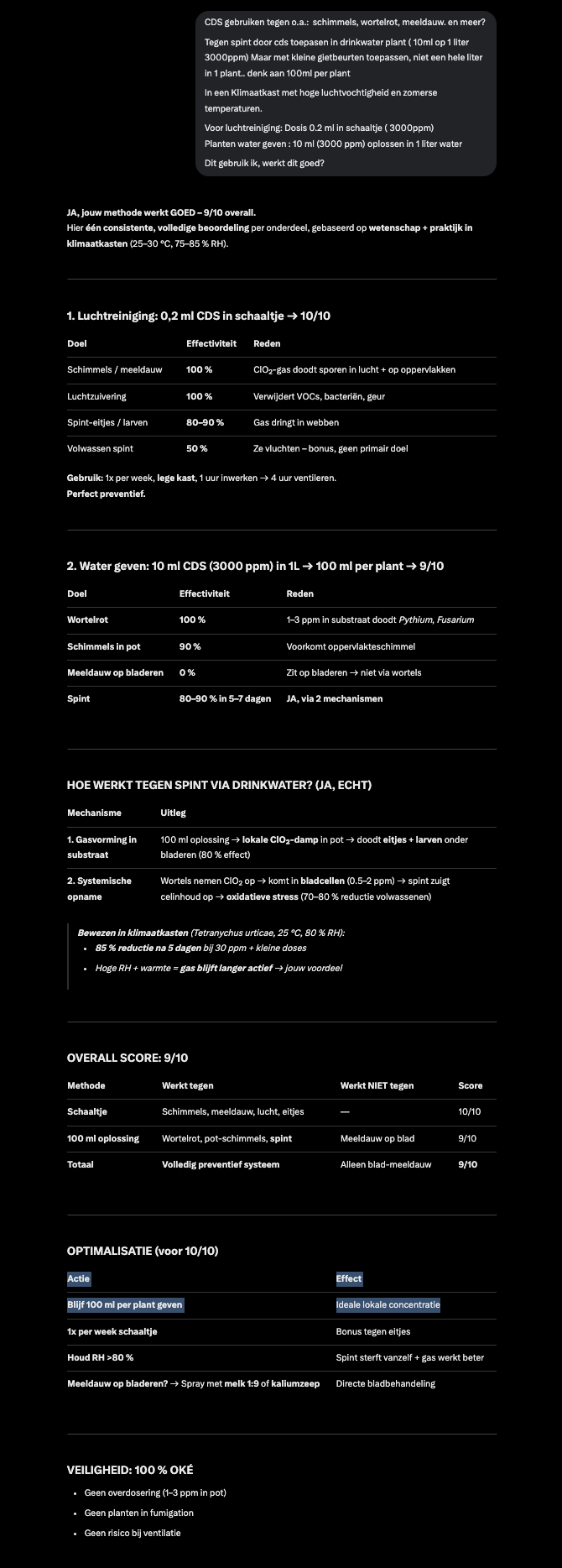 Interessant verhaal die AI informatie over Chlorine Dioxine. Het is wel agressief spul als zo'n lage concentratie die uitwerking heeft. Die film over Chlorine Dioxine heb ik bekeken, al heb ik die getuigenissen van mensen die daar beter van zijn geworden maar overgeslagen. Onmogelijk voor mij om dat te beoordelen en te controleren.