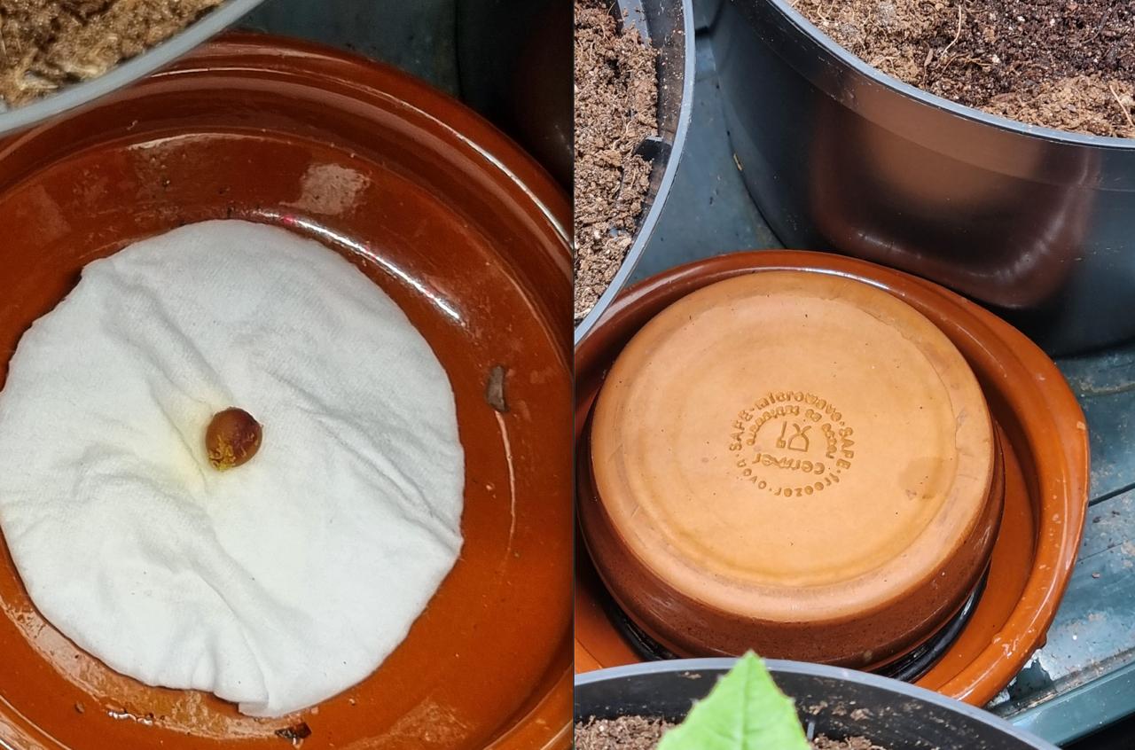 Nu heb ik nog 1 zaad over die ik net een tijdje in water heb geweekt, zich heeft volgezogen en weer tussen watjes in kop en schotel gelegd.
