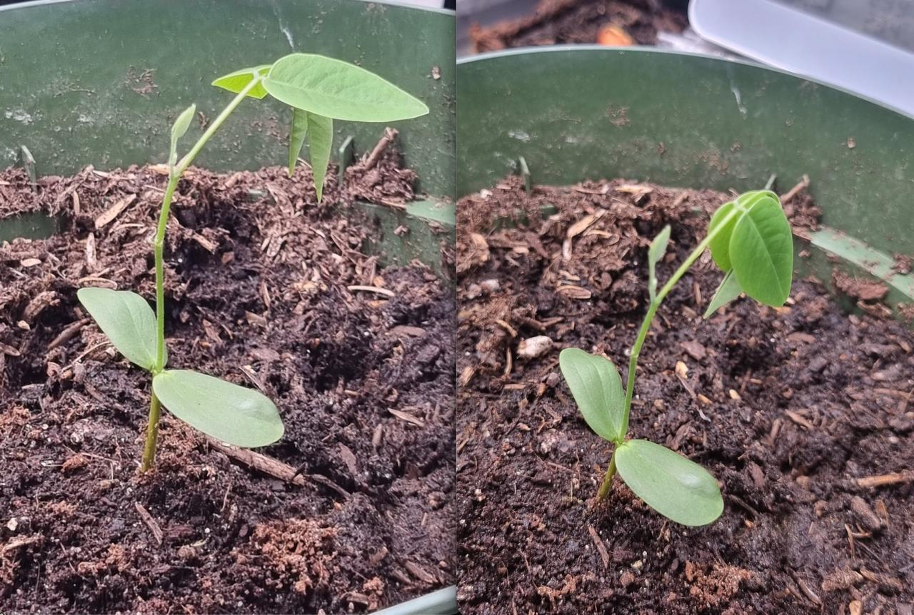 Je ziet dat er twee goed ontwikkelde planten zijn en een kneusje. Er waren vijf zaden waarvan er twee heel klein gebleven waren. De kleine plant zal uit een van die zaden ontsproten zijn. Op de eerste foto op pagina 1 is hij nauwelijks te zien tussen zijn zussen/broertjes.