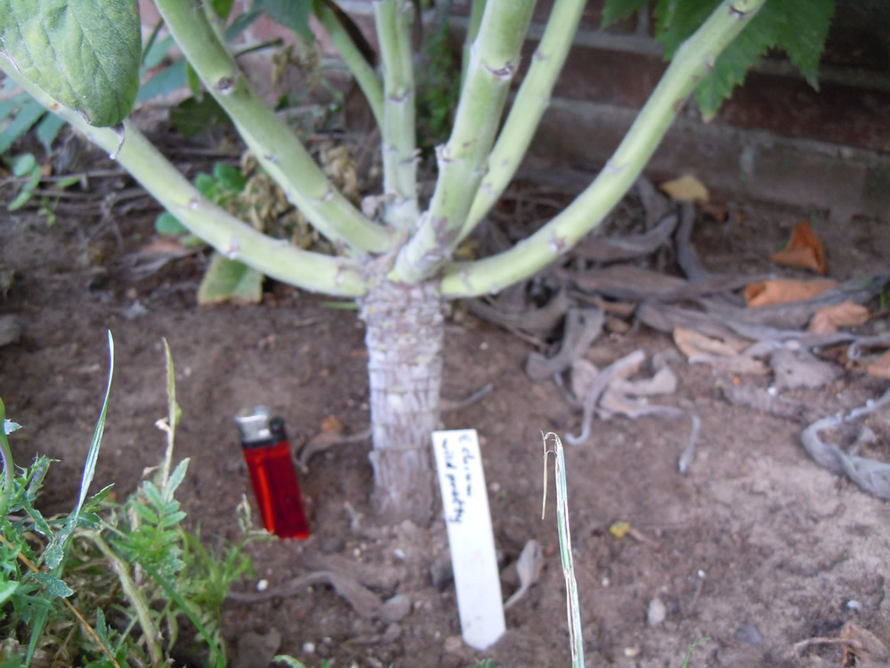 Wanneer ik deze plant google zie ik meestal 1 plant met daarop een bloem. Nu is mijn plant een beetje eigenwijs gaan vertakken met gevolg dat de plant meer dan een m² beslaat (niet goed te zien op foto) en een stam heeft van 4cm doorsnee. Dat zal nog een hele toer worden om die in mijn veel te volle winterstalling (zolder) te overwinteren. :shock: