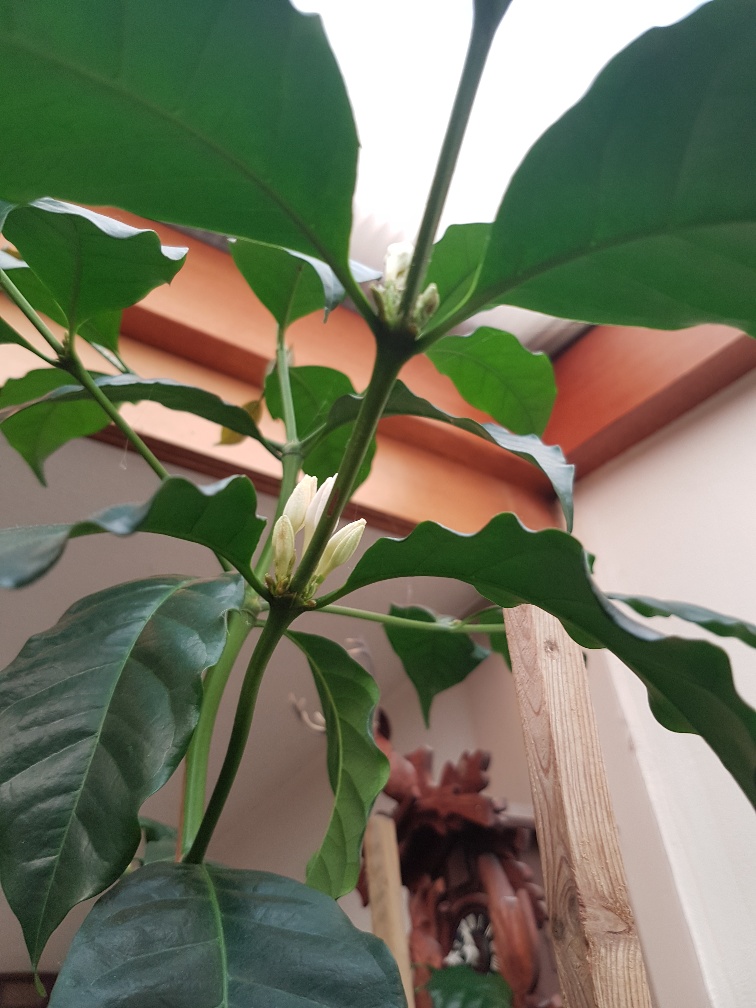 Hierboven de top van de plant. Het ziet er wat iel uit, dat vanwege mijn gesnoei. Nu ik hem weer eens goed bekeken heb herinner ik mij waarom ik zo gesnoeid heb. De plant zat vol met wolluis. Die plaag is vrijwel niet te bestrijden, vooral niet op een koffiestruik. De bast is nogal schilferig en daar verschuilen zich hele luizenkolonies onder. In een blad las ik het advies een aangetaste plant maar weg te gooien en een nieuwe aan te schaffen. Misschien doe ik dat wel. Wat moet je eigenlijk met een koffieplant?