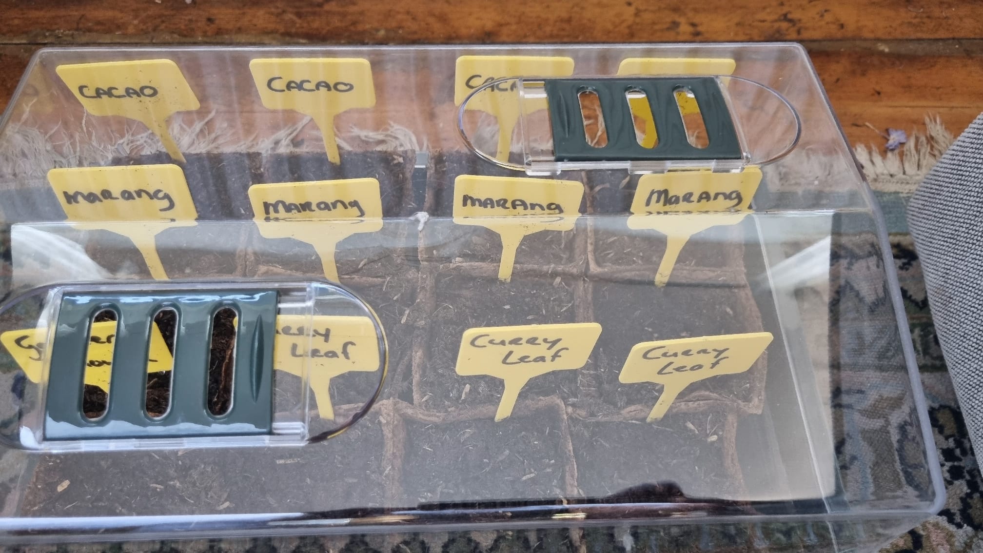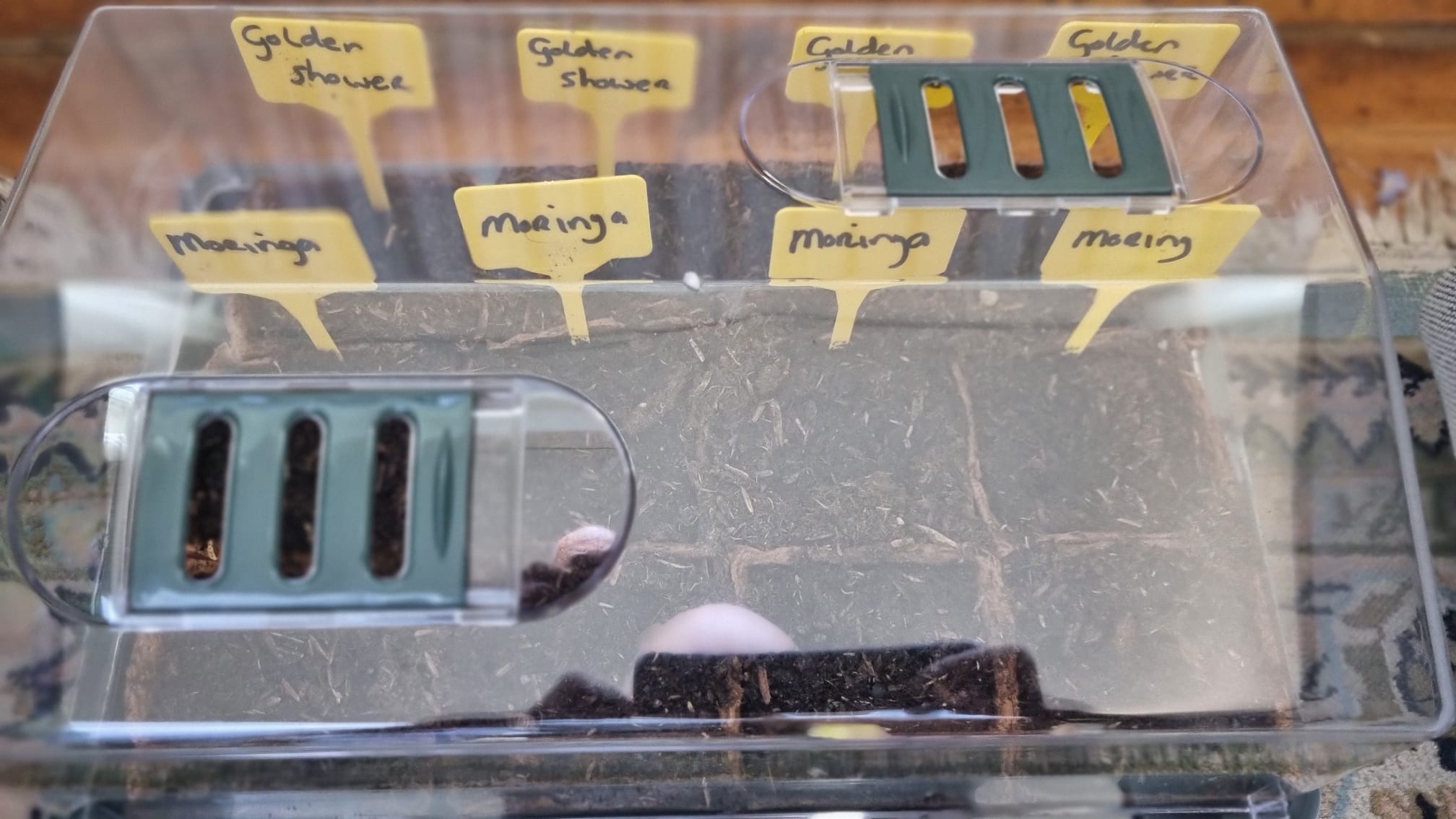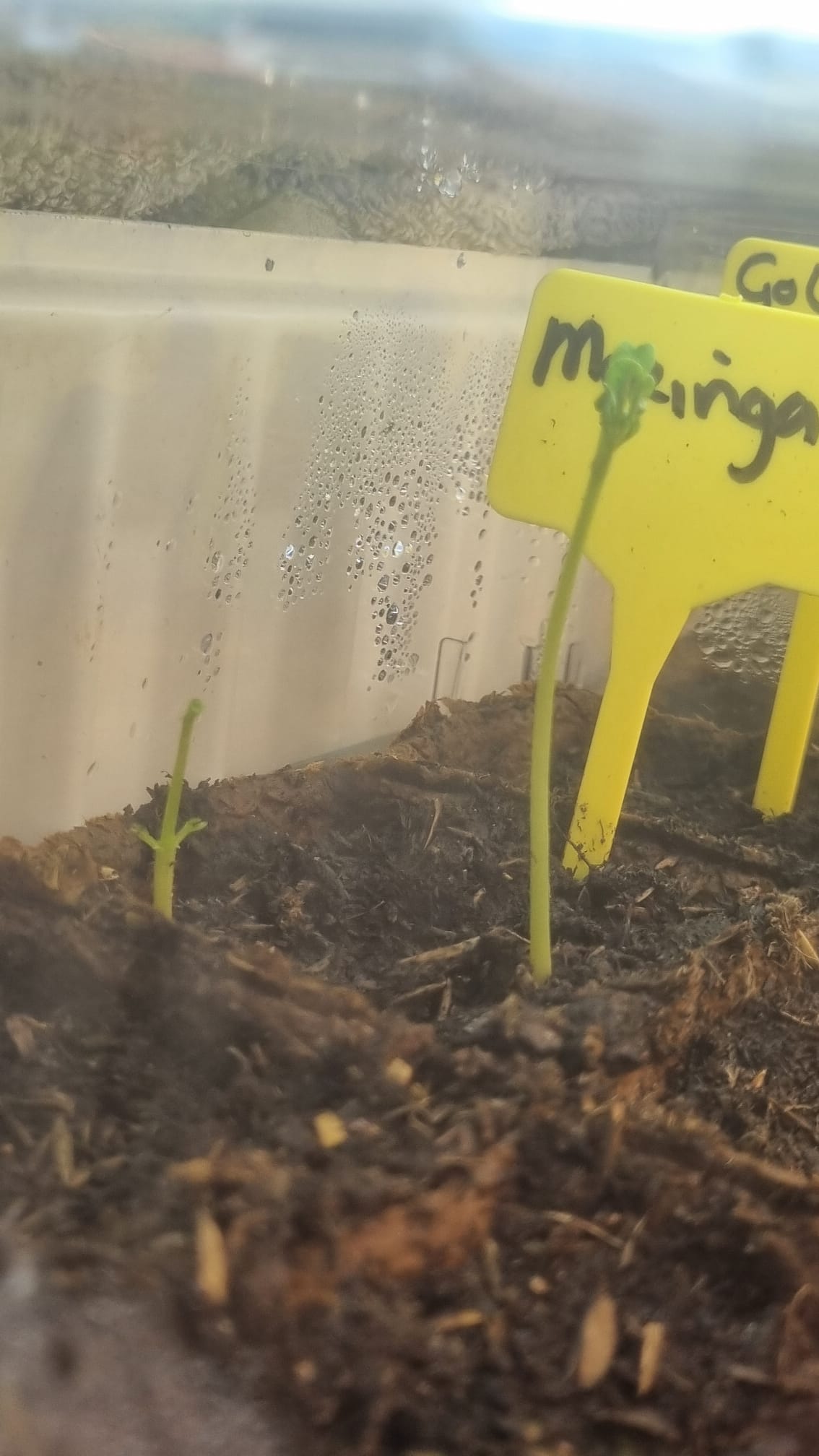 Dag Bonne, Zo te zien zijn het alleen de Moringazaden die ontkiemd zijn. De rest dus nog niet terwijl ze toch al bijna een maand in de grond zitten. De vraag is dan of ze nog gaan komen.