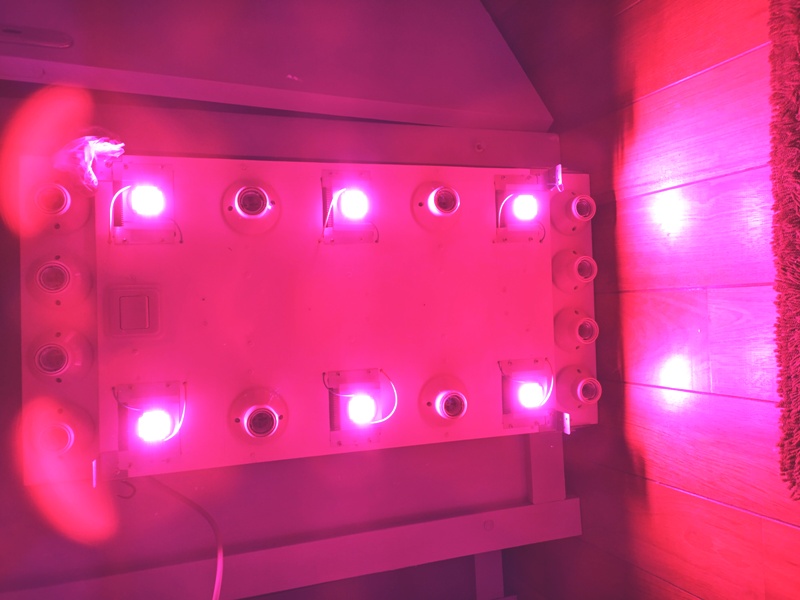 Je ziet twee soorten rood, blauw, ultraviolet, infrarood en wit. De afgebeelde lamp geeft veel geschikt licht en gebruikt toch maar 8 watt. Normaal zit er een kunststof lens op, maar die heb ik verwijderd voor meer rendement.