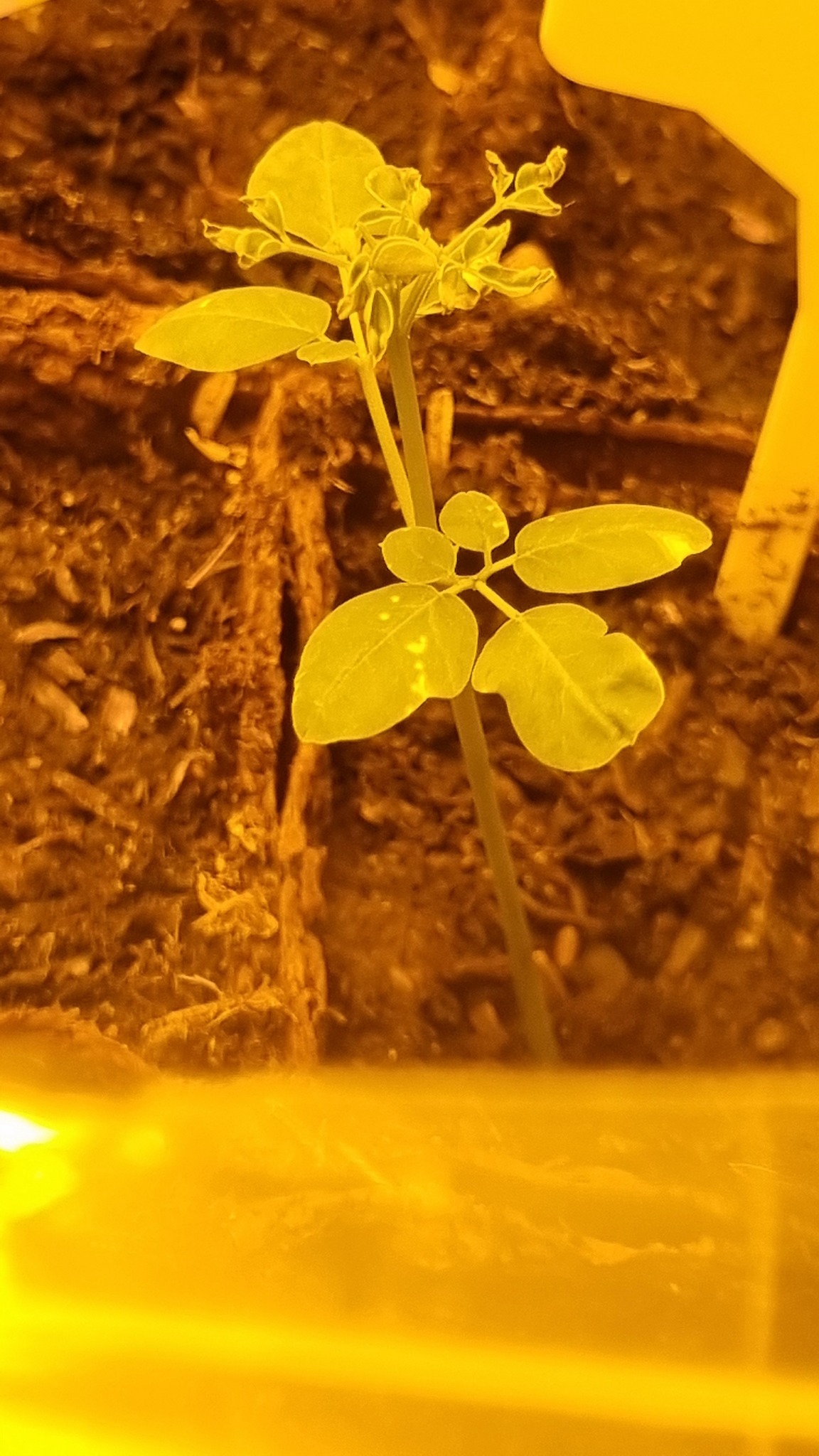 Ik zie dat ze in de kamer staan bij de verwarming met een paar fluorescentielampen er boven. Daar zijn tropische planten niet echt tevreden mee. De Moringa's die zijn opgekomen strekken ook op zoek naar licht, de warme tropenzon dus. De Moringa die ik heb houdt in de winter min of meer op met groeien en begint weer te groeien in de lente als er meer licht is.