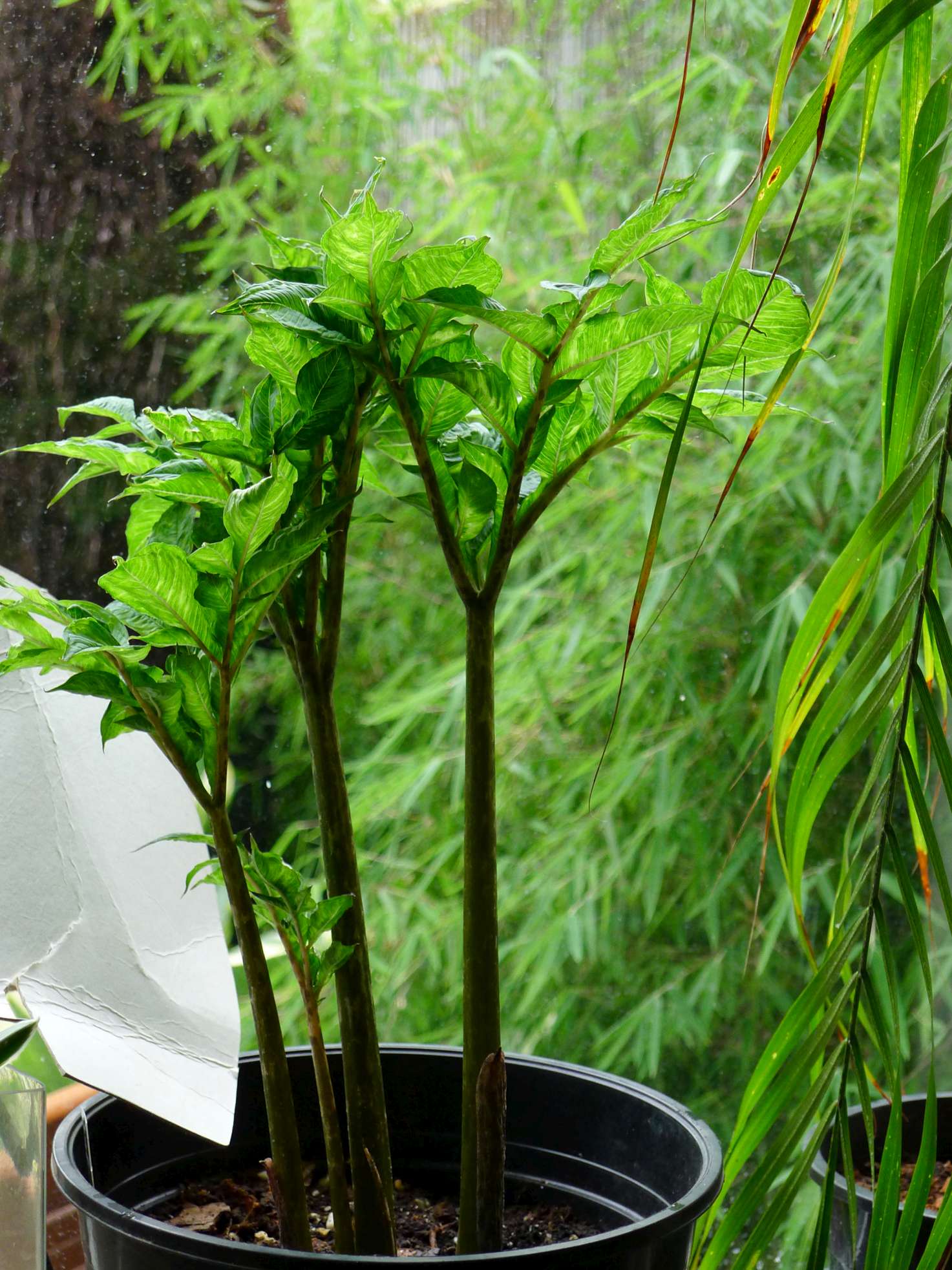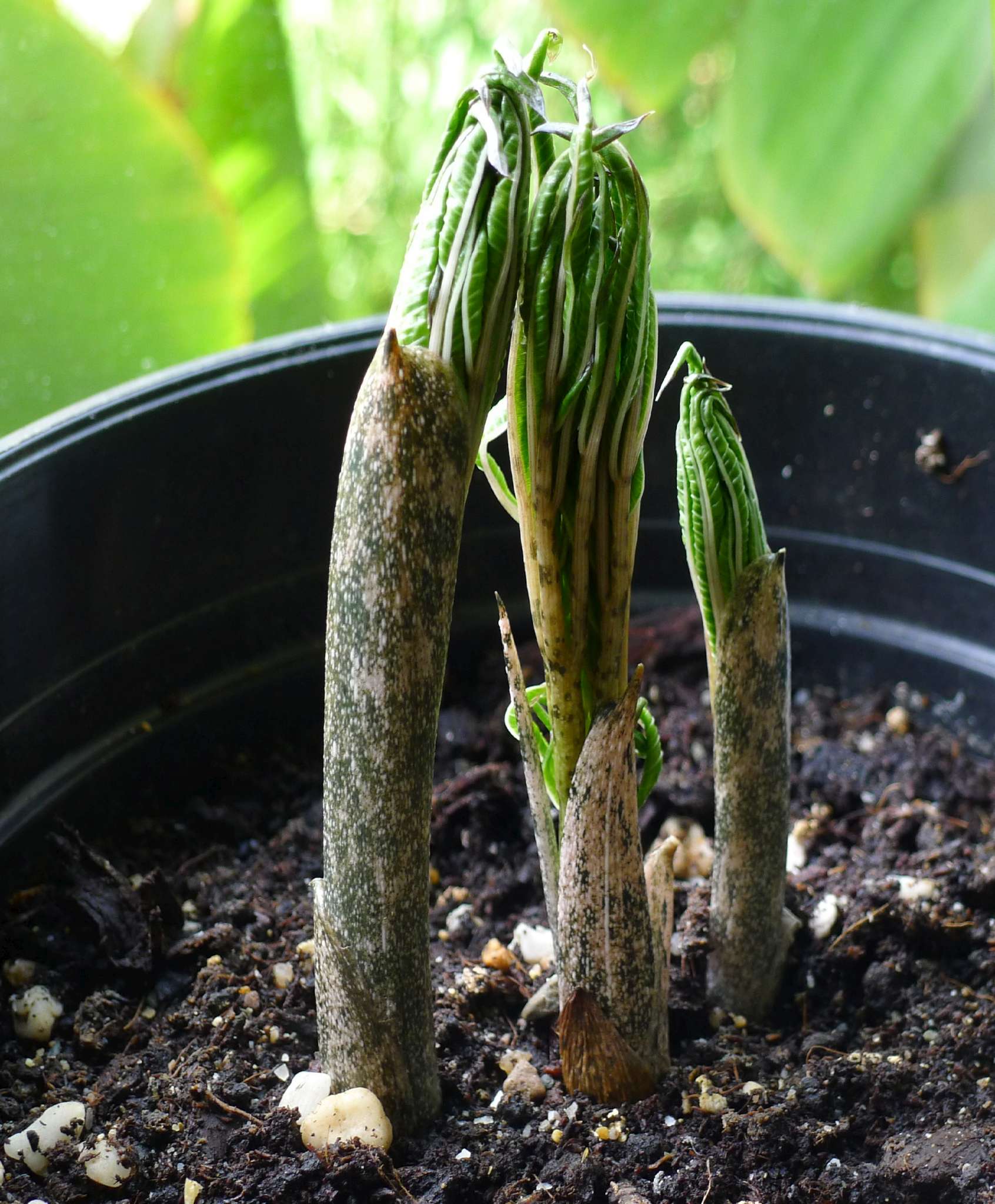 Zowel de Amorphophallus konjac als de Amorphophallus bulbifer beginnen uit te vouwen.