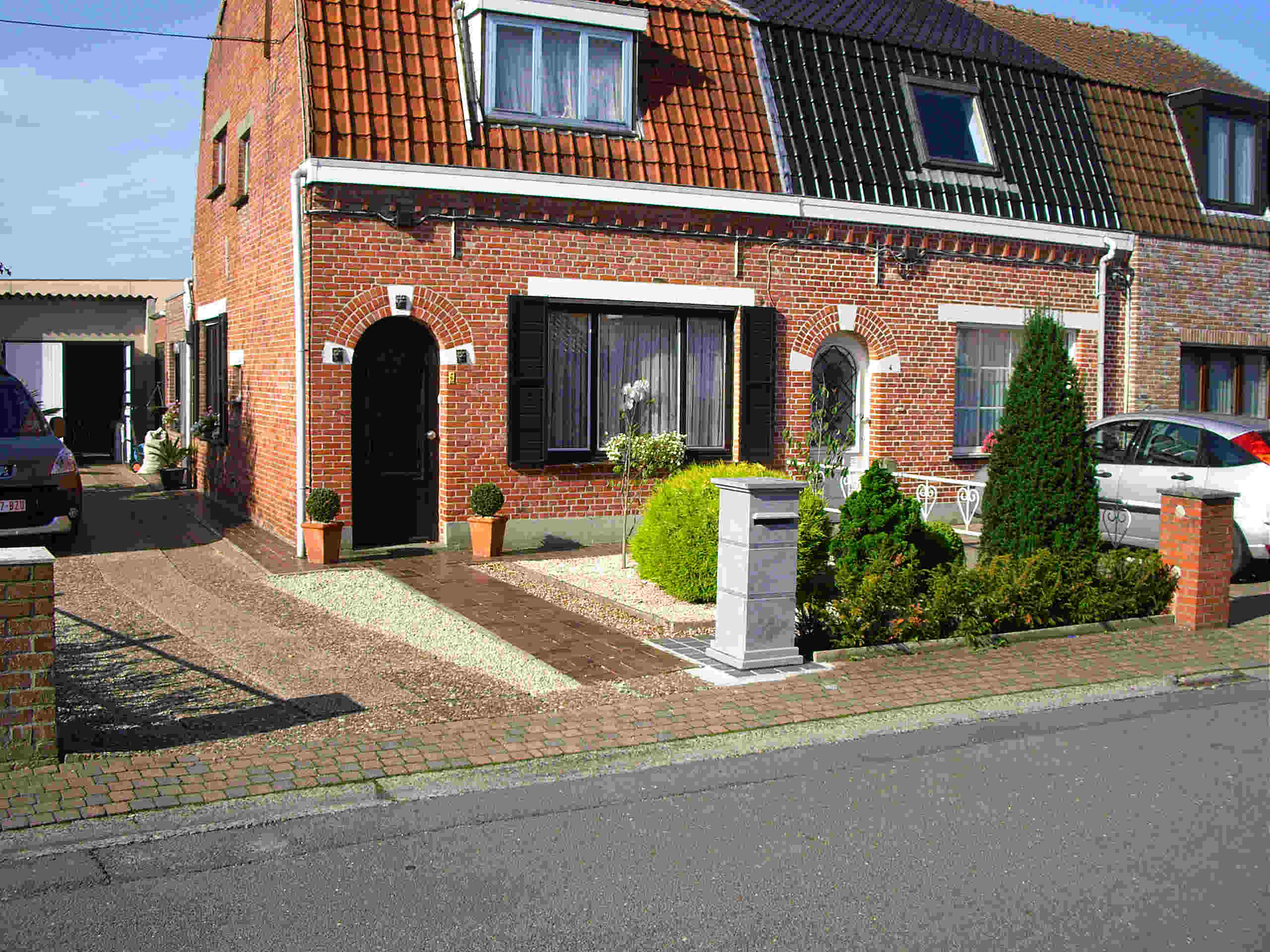 Hier een fotoke van de bestaande voortuin. Alle planten worden verwijderd eveneens de keien.Rechts komt een nieuwe afsluiting van 0.90 hoog(cocopaneel). int midden v/h tuintje komt een graniet paadje van 0.60 breedt, int center van tuin springt het padje rechts in om zo rechtegenover de deur uit te komen. (brievenbus wordt verplaatst en komt rechts naast het padje vooraan), evenals voor de voorgevel een paadje.de oprit en het voetpad worden gescheiden met een betonborduur. Maar nu de beplanting? in ieder geval wil ik een blikvanger in bak (olea europea bonsai), siergras, lavendel,buxus als afboording, maar ook wat exotische bloeiers? suggesties?