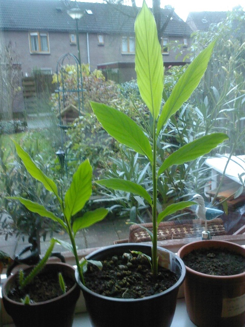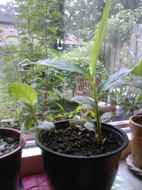 links: een dadelpalm waar een 2e blad uitkomt, midden: de gemberplant (1/2 m hoog), rechts: een chamaerops humilis varcifera (2e blad begonnen)