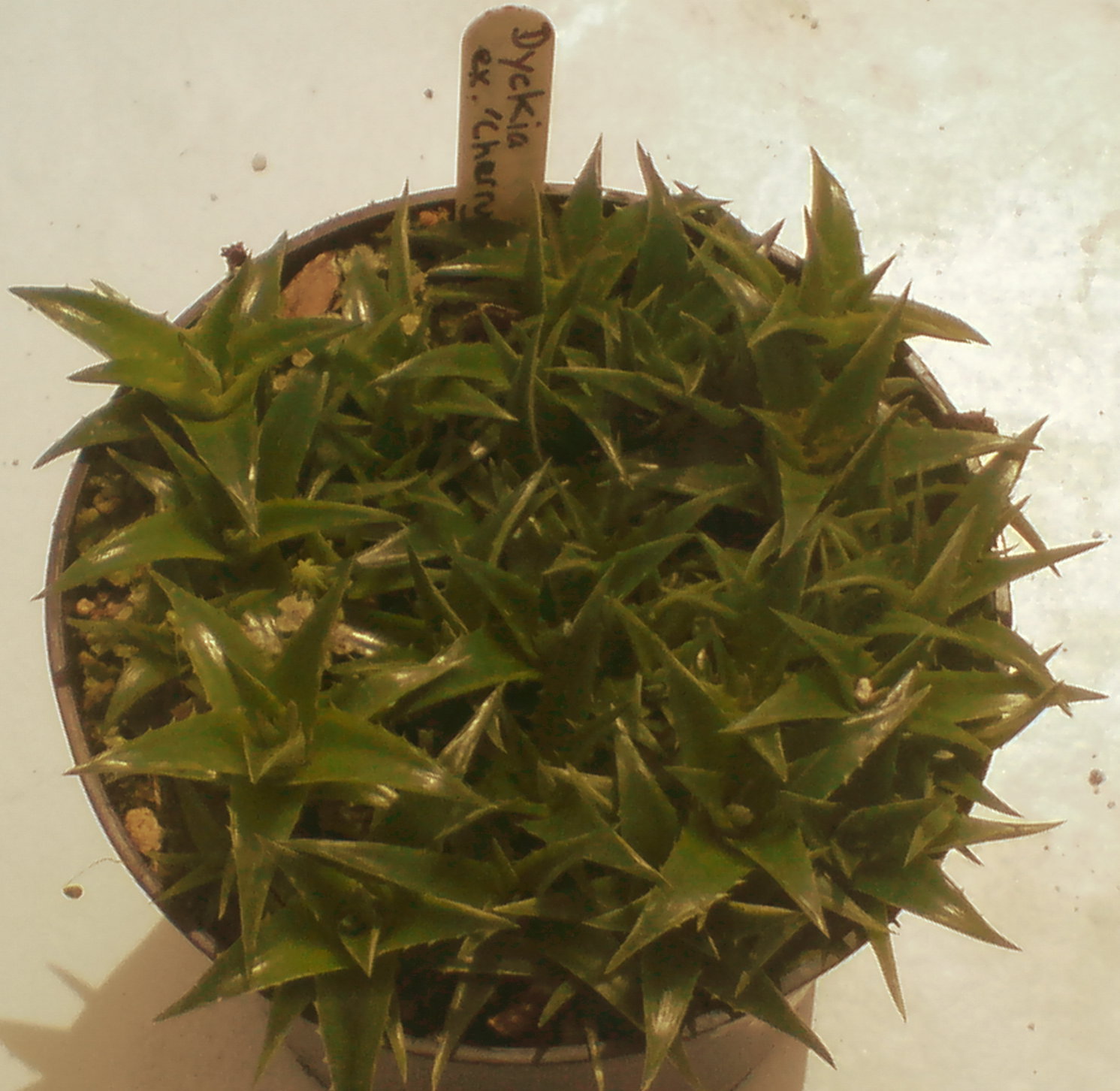 dit is een foto van de persoon waarvan ik de Dyckia's heb gekocht. Toen zagen ze er nog mooi uit, helaas heeft hij ze met kluit modder en al in een plastic doosje zo naar mij op gestuurd. De toppen van de blaadjes waren bij de meeste dyckia's afgebroken. De plantjes waren onherkenbaar door de modderachtige substantie. Ik heb ze allemaal apart opgepot. Na enkele dagen de plantjes met een haren penseeltje voorzichtig ( droog) afgepoetst. Helaas heeft de helft het niet overleefd en is gaan rotten. De andere doen het goed.