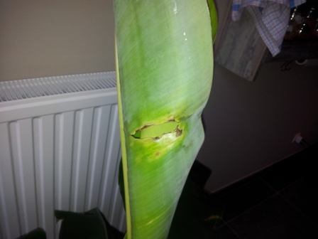 * Het laatste blad is half open maar heeft al een rare plek op zijn blad. Heeft hier iemand een verklaring voor?