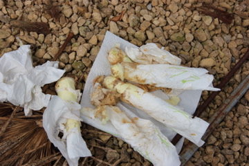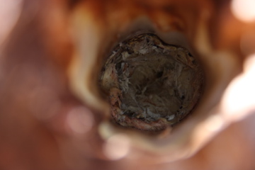 Ik kon redelijk veel speren uittrekken en in het gat vanonder zelf was er ook veel gele schimmelbrij uit te halen. Ik zie wel vezels zitten in het gat...