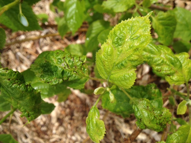Eerste symptomen waren dat de bladeren zwarte vlekken begonnen te vertonen, grotere dus niet echt een puntje van een pen, maar een paar mm groot. Na enkele dagen beginnen deze bladeren te krimpen en opgefrommeld te lijken.