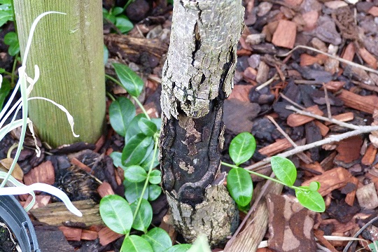 Dat lijkt me heel sterk. Het lijkt op een oude bastbeschadiging. Soms kan de bast beschadigen door er tegen aan te stoten of door bevriezing. Aan de grond is het meestal het koudst dus zou zo maar kunnen. Je ziet ook wel dergelijke schades als men bomen hijst bij verplanten in het groeiseizoen waardoor de bast als het ware losstroopt. In alle gevallen kan het zo zijn dat de schors aan de buitenkant gewoon blijft zitten en dat je er dus niets aan ziet. Soms merk je het aan wat tegenvallende groei. Maar een jaar of meer jaren verder valt ineens de oude schors eraf en wordt de oude schade zichtbaar. Vaak omdat door diktegroei van de wondranden (goed zichtbaar op de foto) de oude schors naar buiten wordt gedrukt, gaat scheuren (zie bovenzijde foto) en dan uiteindelijk er af valt. De zwarte kleur van het onderliggende spinthout is ook een teken dat het een oude schade is die lang vochtig is gebleven.