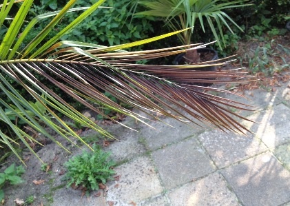 Een aantal bladeren van mijn Roebelinni zijn bruin geworden aan de uiteinden