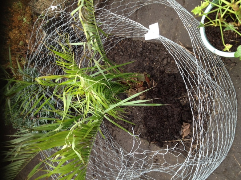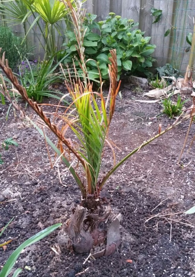 Mijn Butia eriospatha leek in februari prima de winter te hebben doorstaan. Ik had hem beschermd met vliesdoek, warmtekabel en een hokje van noppenfolie. Het was de eerste winter.